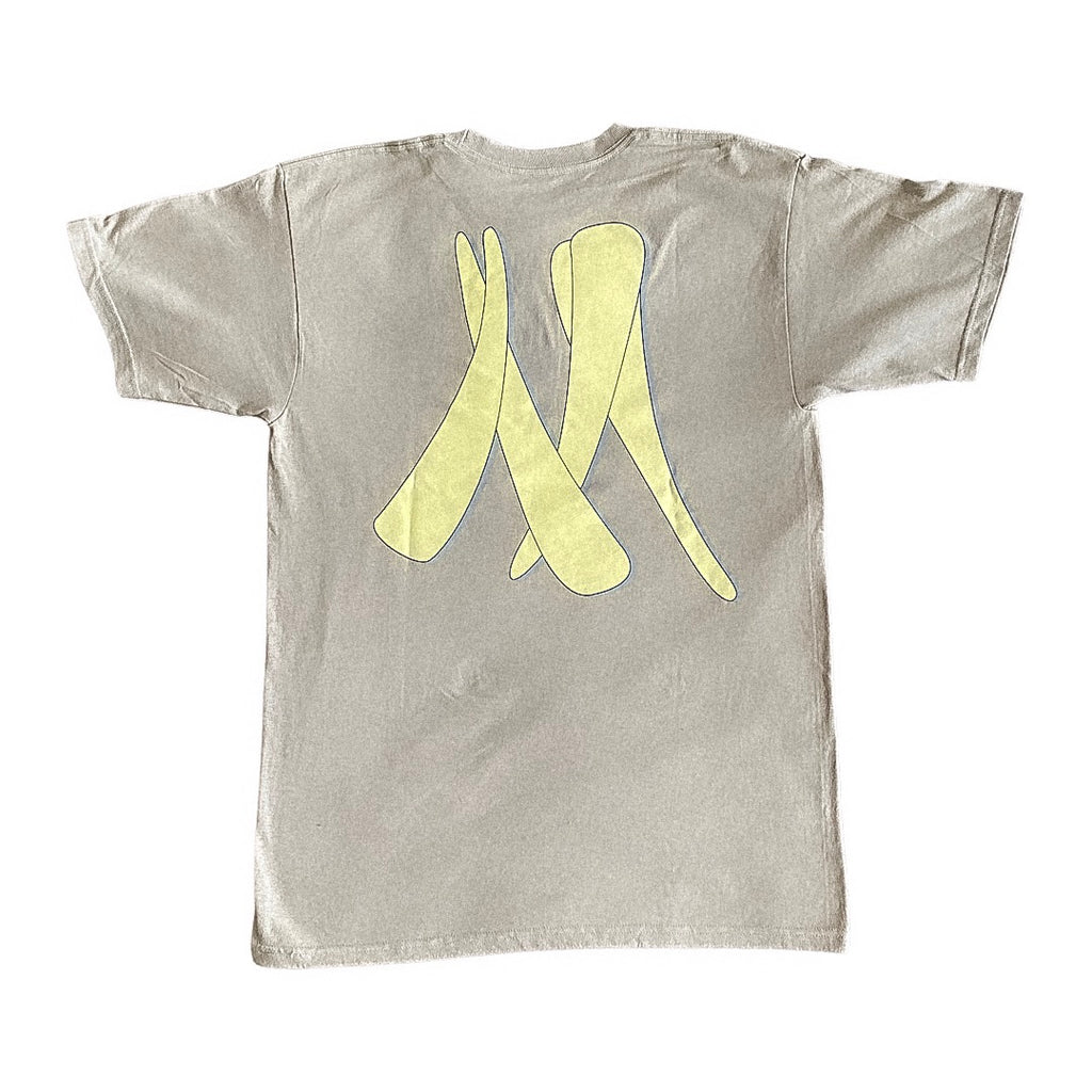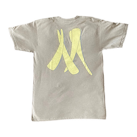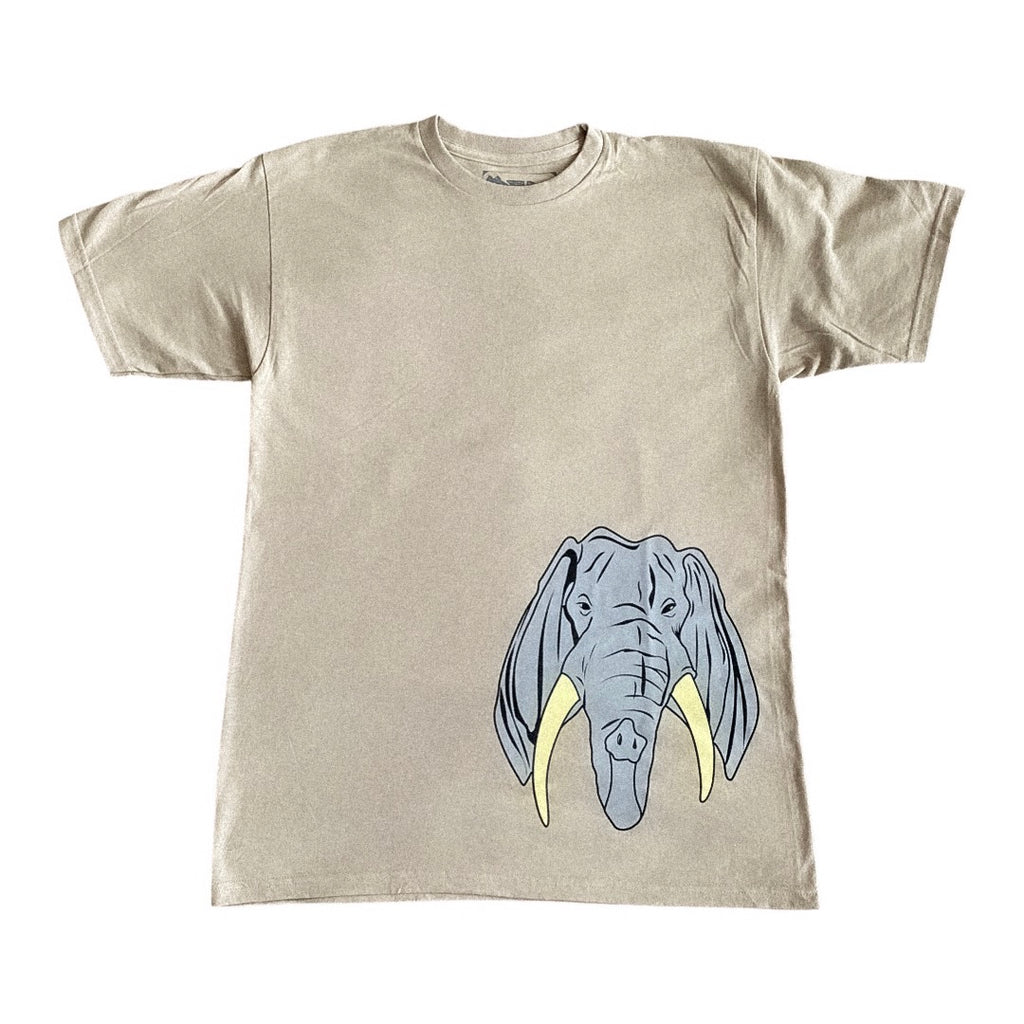 Tan, Fitted Tee. Mazuma elephant pictured on front, with large Mazuma Elephant Tusk featured on the back.