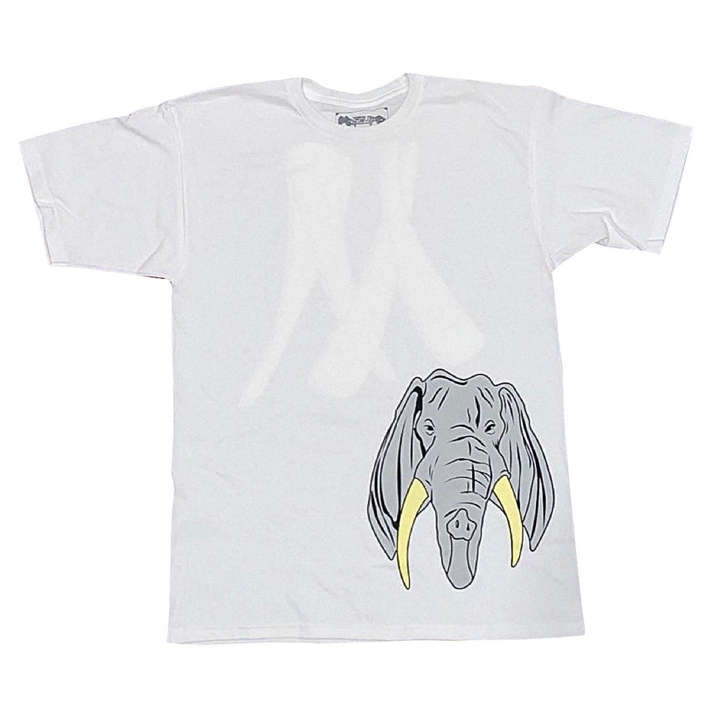 white, Fitted Tee. Mazuma elephant pictured on front, with large Mazuma Elephant Tusk featured on the back.