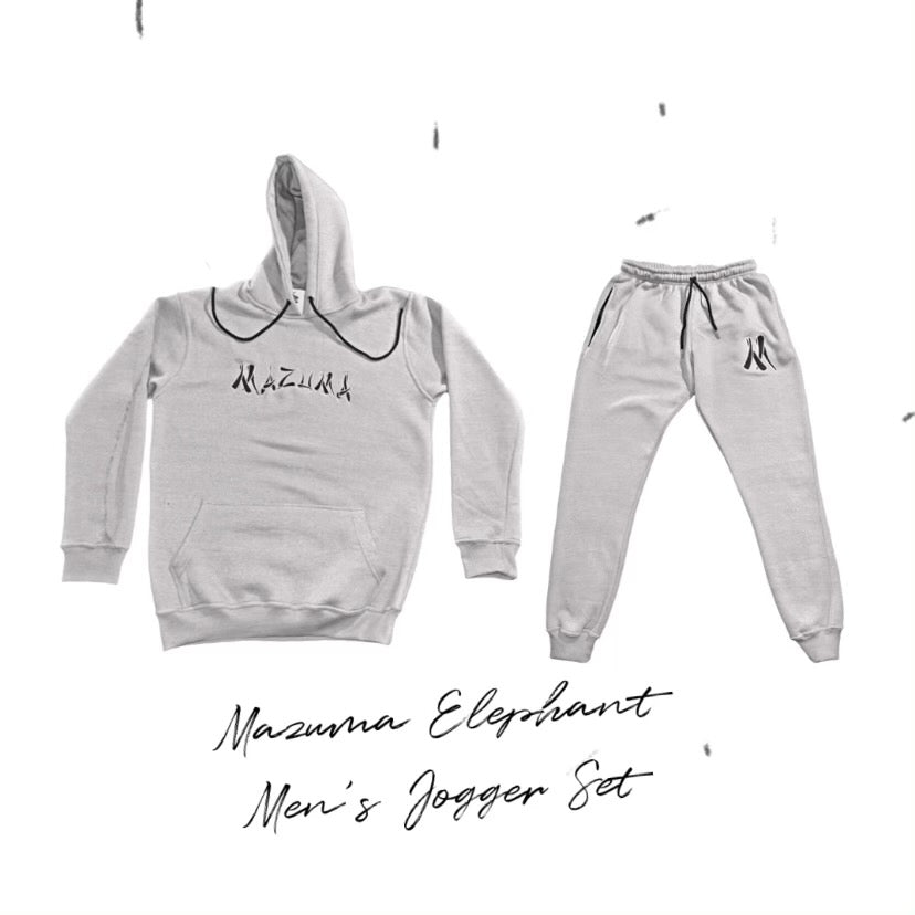 Grey hoodie jogging suit with navy blue Mazuma tusk.